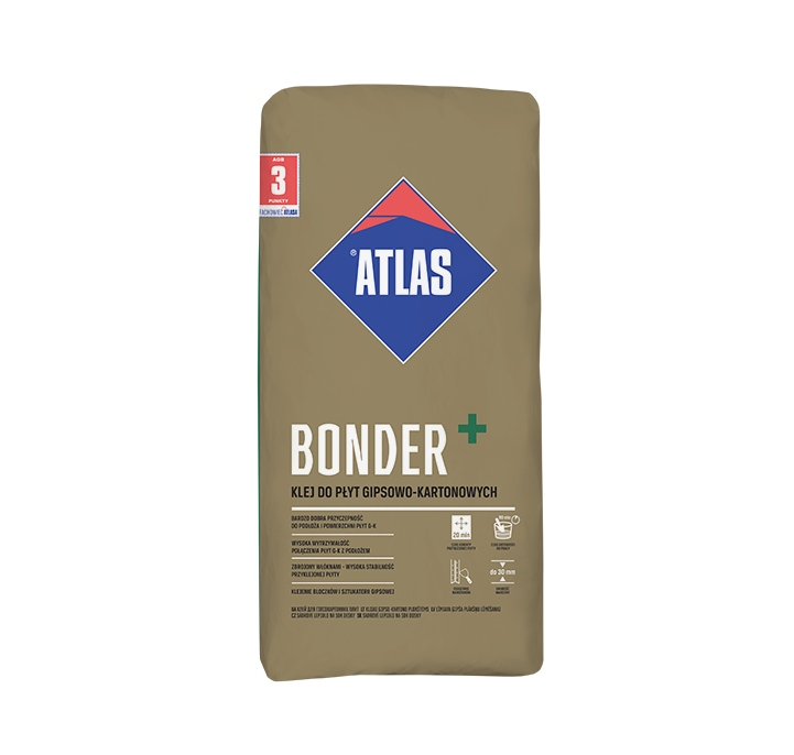 - ATLAS BONDER+ produkowany jest w postaci suchej mieszanki na bazie gipsu syntetycznego oraz wypełniaczy mineralnych i dodatków modyfikujących.