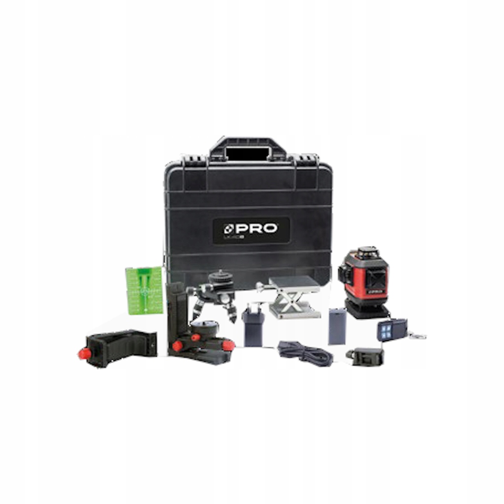 Bogaty zestaw akcesoriów umożliwi i ułatwi pracę w każdych warunkach, m.in. pilot zdalnego sterowania– pomoże gdy laser jest poza zasięgiem ręki; ogumowana winda nożycowa – nieodzowna w szczególności przy pracy na śliskich podłożach, np. w łazienkach wielofunkcyjny wieszak ułatwi montaż lasera na wiele sposobów
