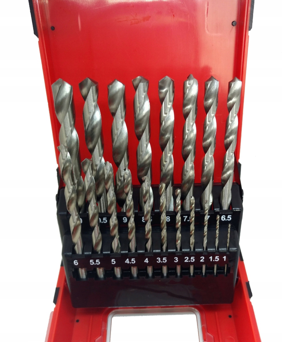 - Zawartość zestawu: Wiertła o różnych średnicach, 19 sztuk w rozmiarach: 1,0 mm, 1,5 mm, 2,0 mm, 2,5 mm, 3,0 mm, 3,5 mm, 4,0 mm, 4,5 mm, 5,0 mm, 5,5 mm, 6,0 mm, 6,5 mm, 7,0 mm, 7,5 mm, 8,0 mm, 8,5 mm, 9,0 mm, 9,5 mm, 10,0 mm